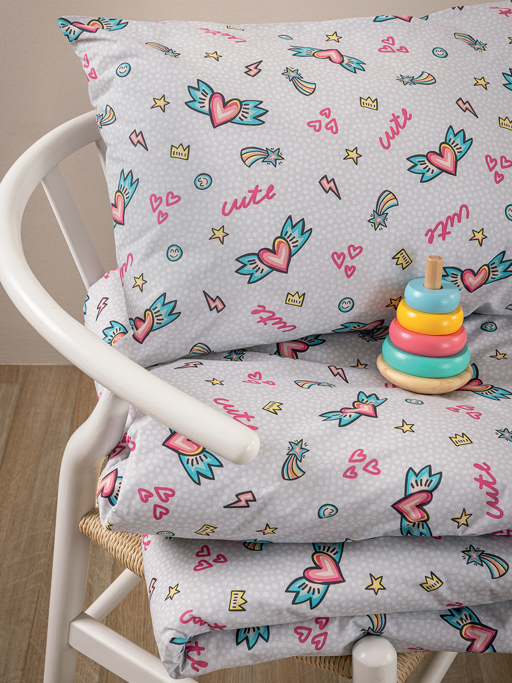 1 Πανωσέντονο 170×260, 1 Κατωσέντονο 170×260 ή 1 Κατωσέντονο 110×200+32, 1 Μαξιλαροθήκη 52×72