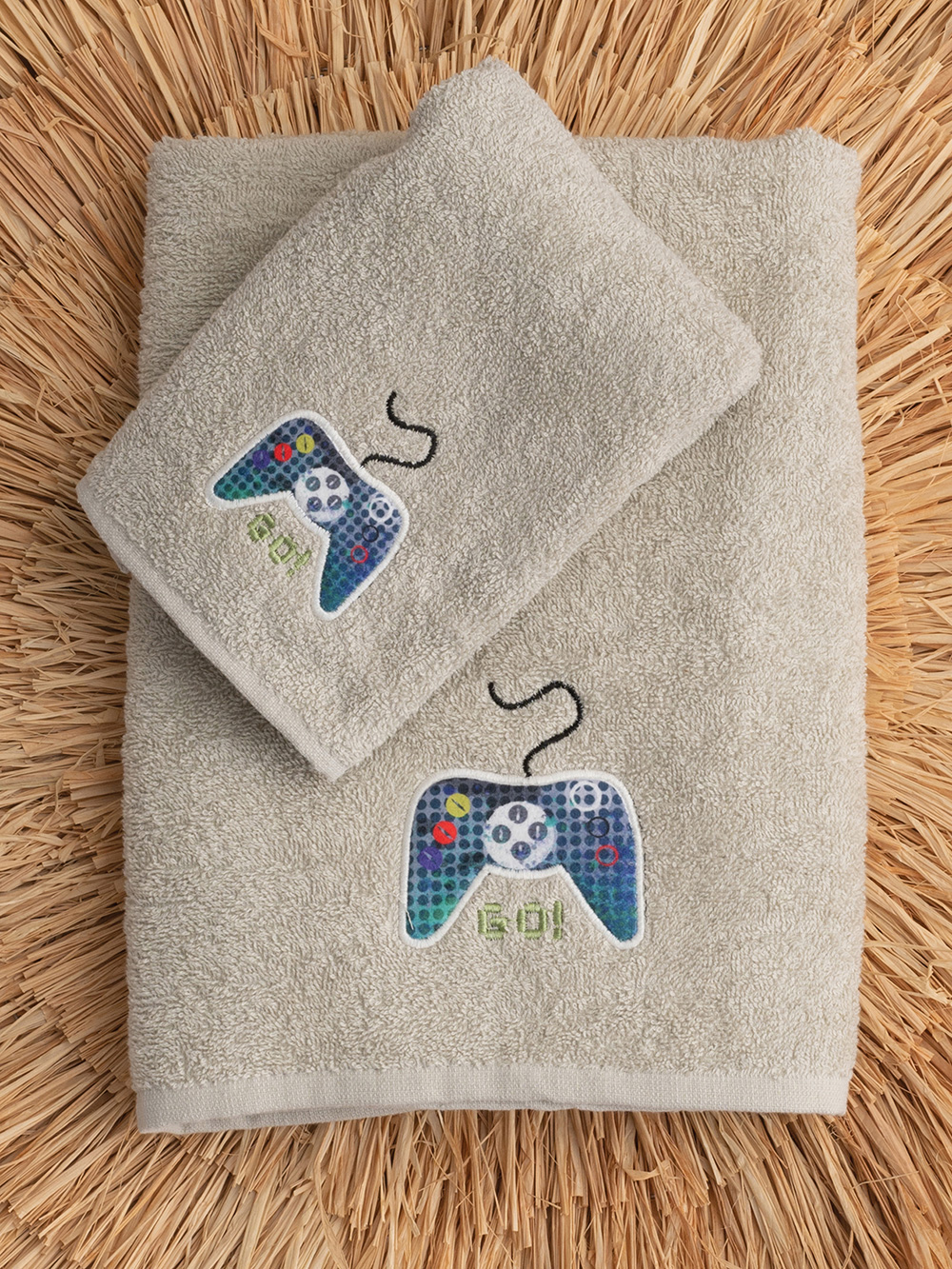 Σετ πετσέτες Kids Bath PLAYER με κεντητές παιδικές παραστάσεις από 100% βαμβακερό ύφασμα.Το σέτ περιλαμβάνει 1 πετσέτα 40×70 και 1 πετσέτα λουτρού 70×140.