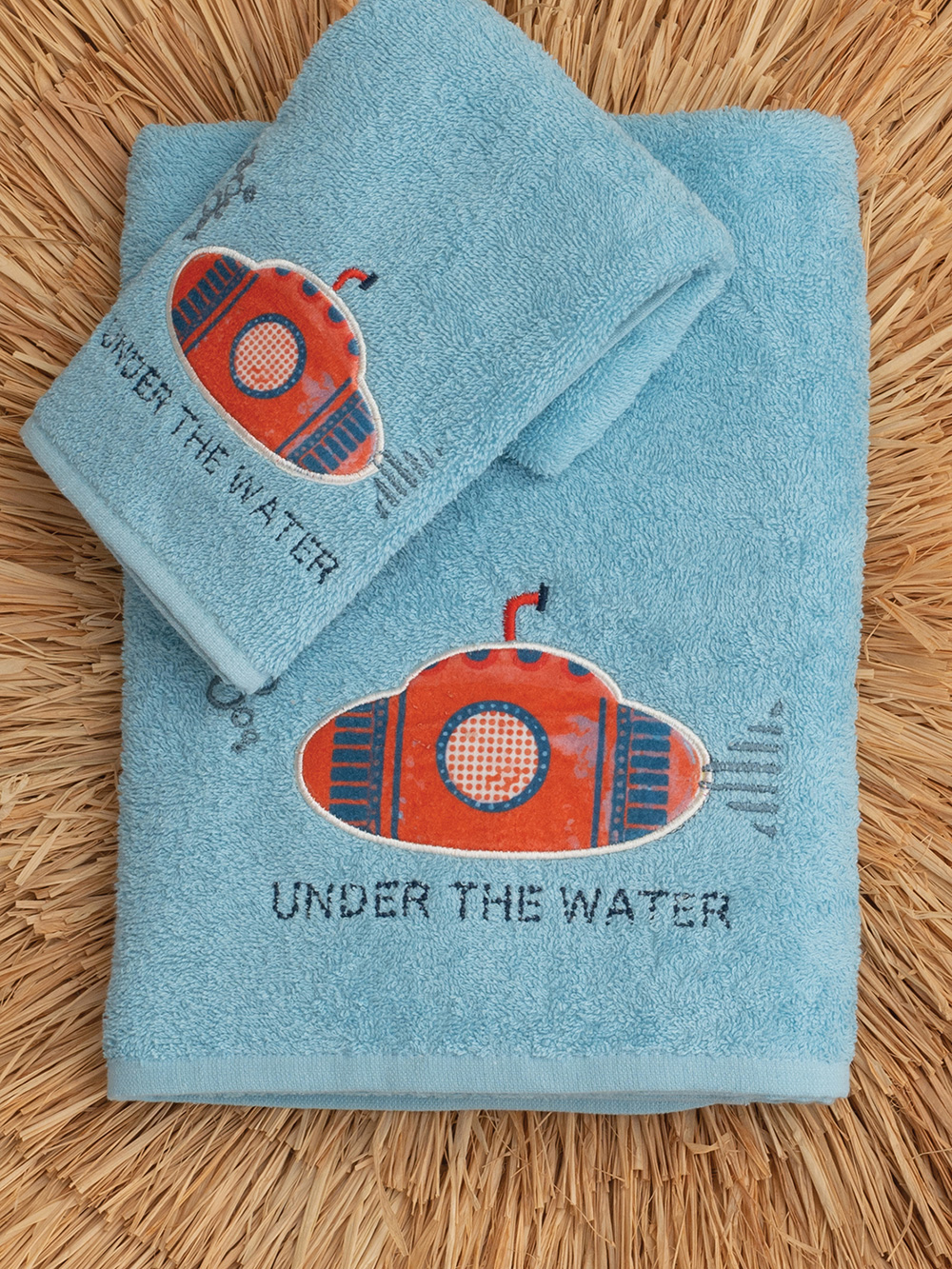 Σετ πετσέτες Kids Bath SUBMARINE με κεντητές παιδικές παραστάσεις από 100% βαμβακερό ύφασμα.Το σέτ περιλαμβάνει 1 πετσέτα 40×70 και 1 πετσέτα λουτρού 70×140.