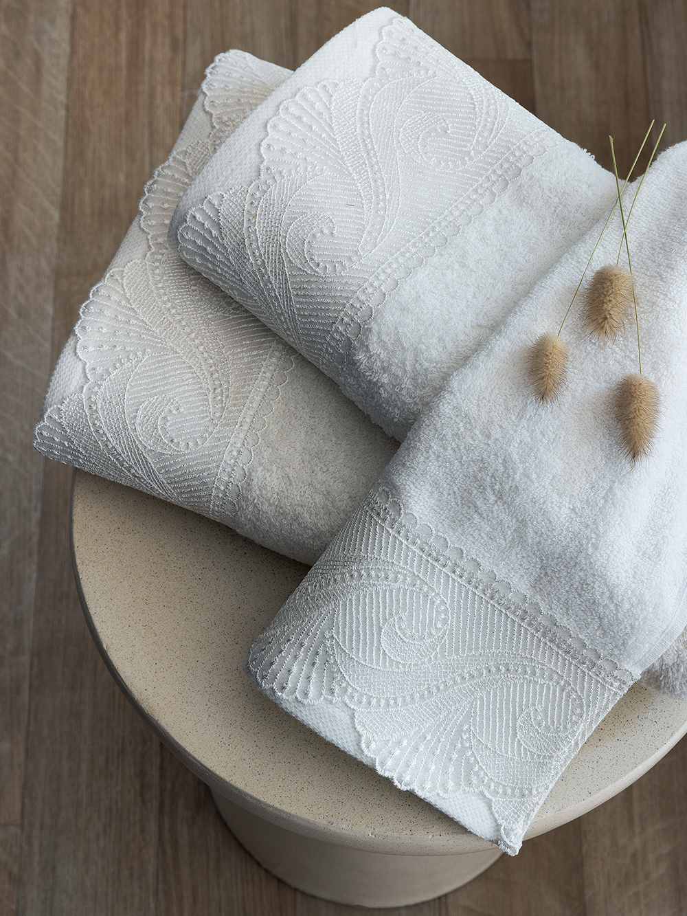Σετ Πετσέτες Μπανιου EMY από ύφασμα 100% βαμβάκι με κεντητή δαντέλα 500 γραμμαρίων ανά m². Το σετ περιλαμβάνει 1 πετσέτα χεριών 30×50, 1 πετσέτα προσώπου 50×90 & πετσέτα λουτρού 70×140.