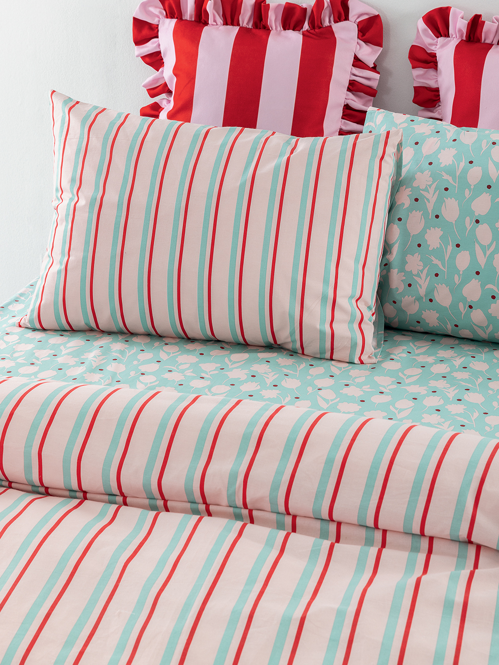 1 Πανωσέντονο 240×260, 1 Κατωσέντονο 240×260 ή 1 Κατωσέντονο με λάστιχο 170×200+32 & 2 Μαξιλαροθήκες 52×72